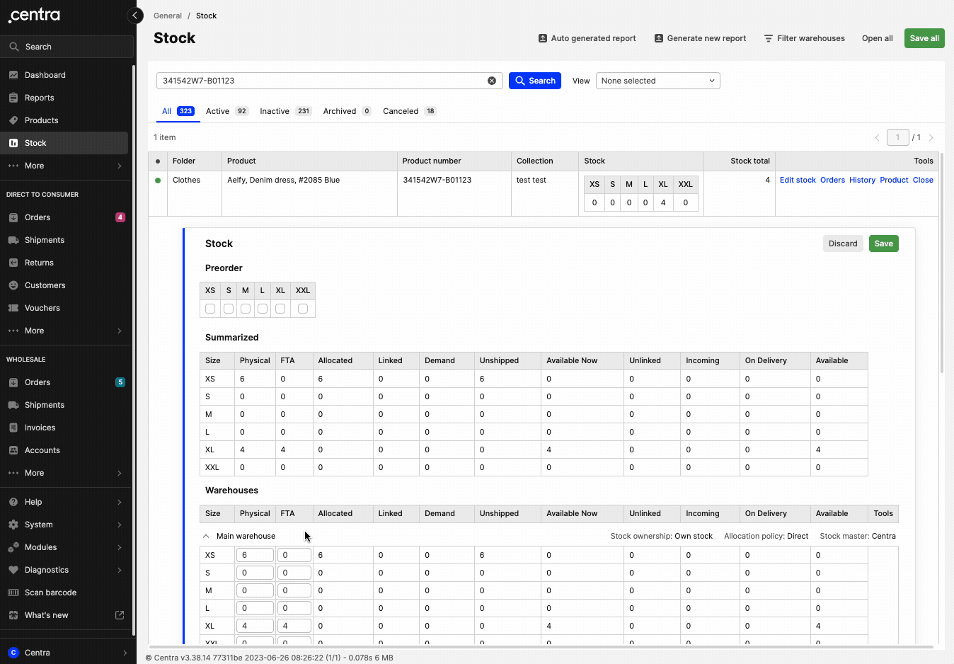 - Editing stock levels in the Stock View is done using the principle of setting new stock levels. In the Warehouses section, the fields for Physical and FTA values can be edited. Example: If your current stock level for a certain product is 7 pcs in size XS but you would like to change that to 10 pcs, you simply do so by typing 10 in the XS field in the respective warehouse. More scenarios are described in the section below.