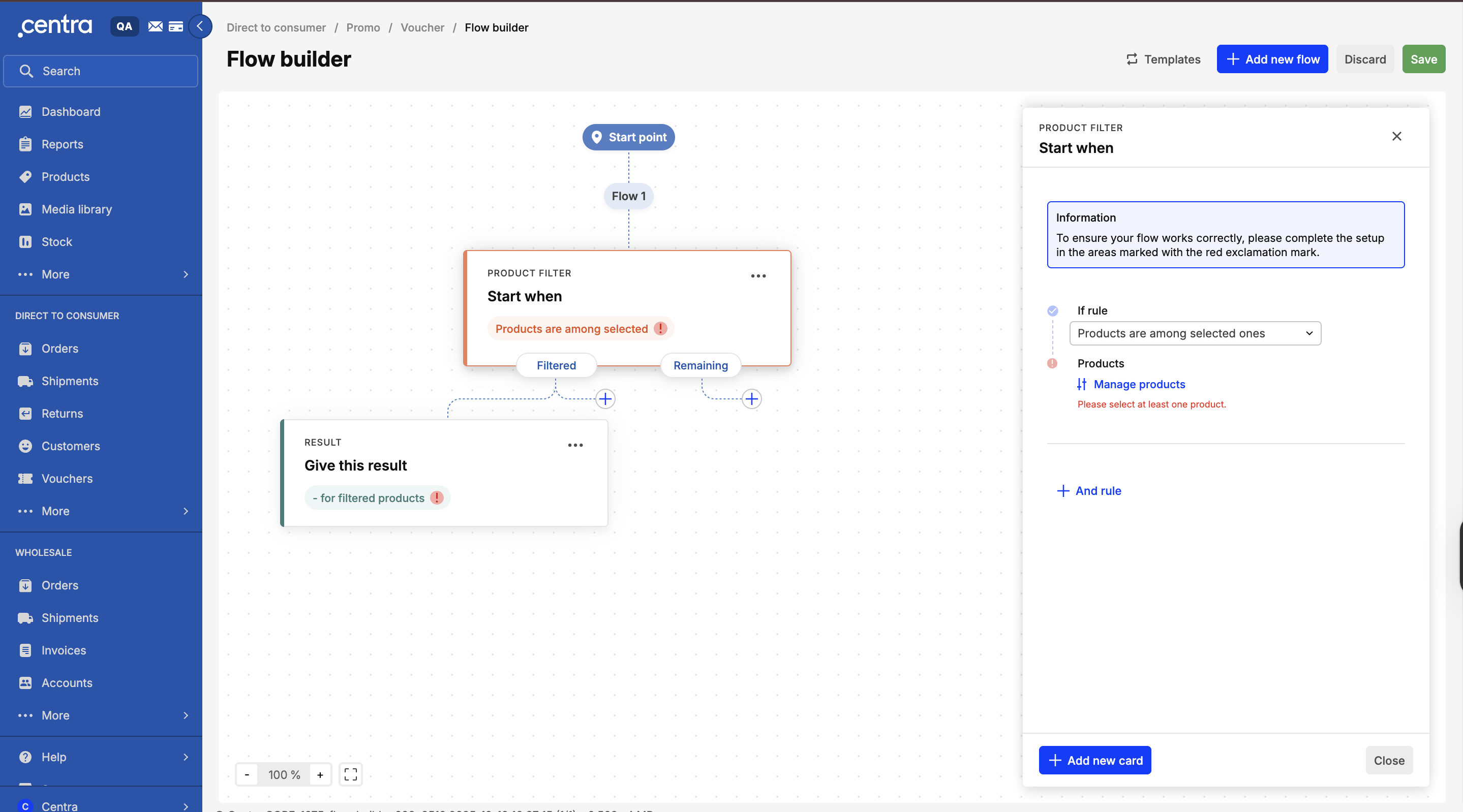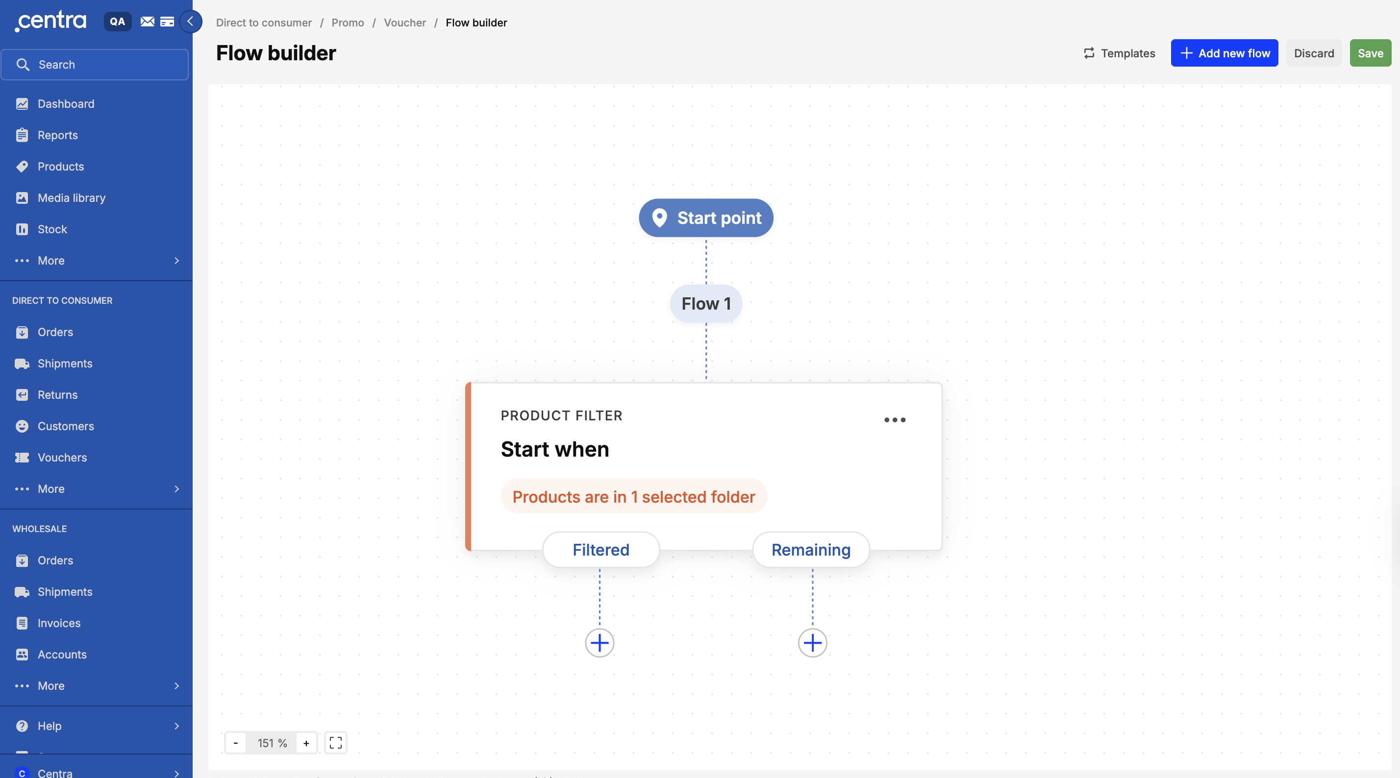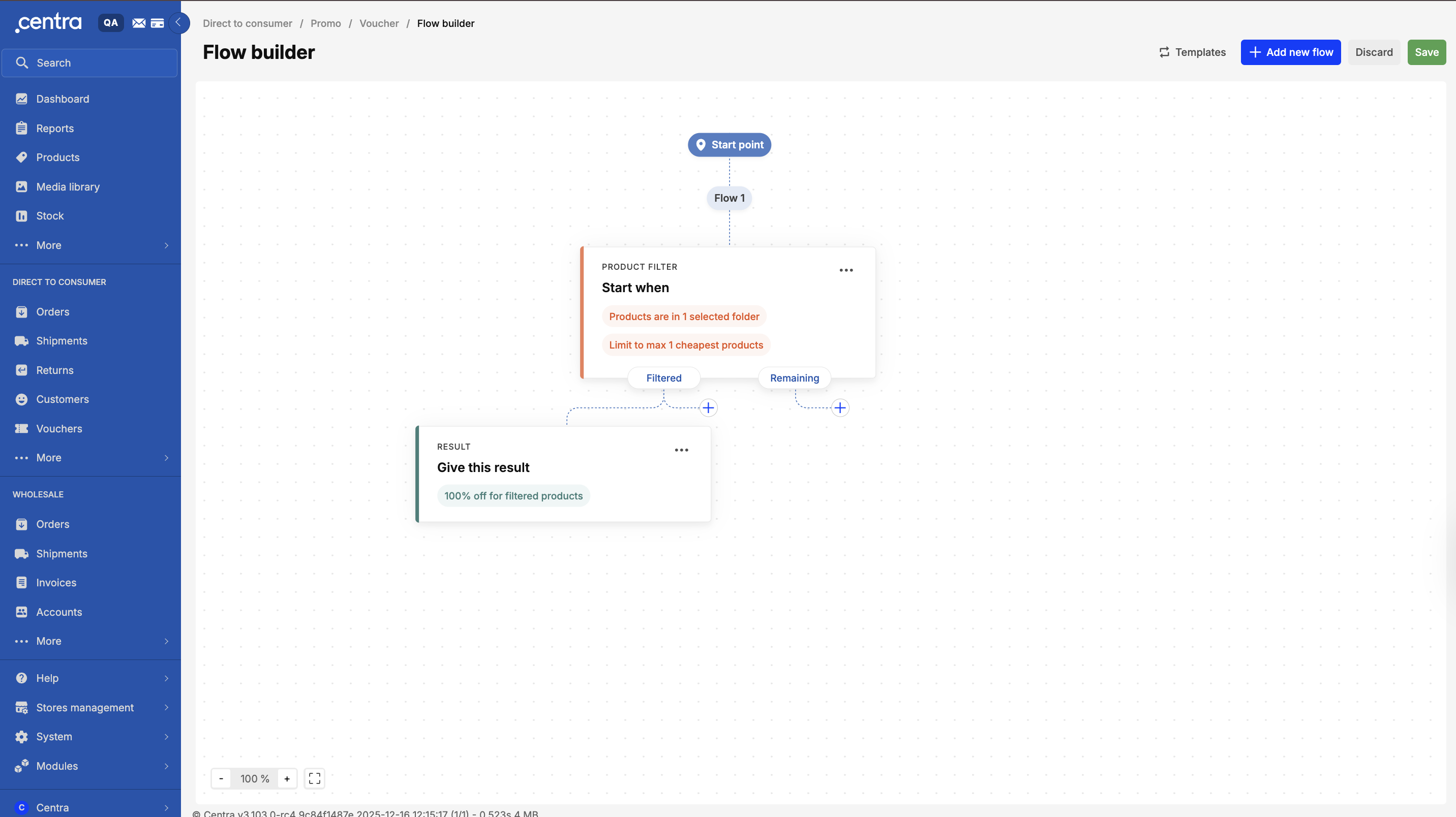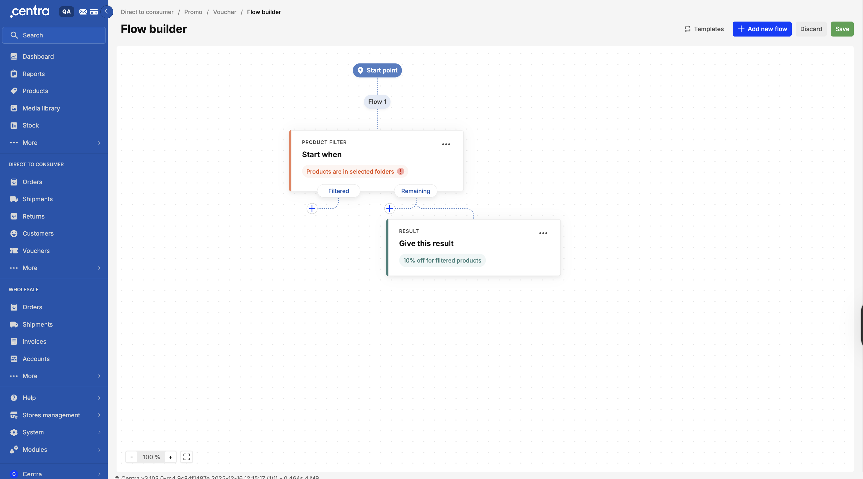 Create advanced promotions using flexible, visual logic. The Voucher Flow Builder is Centra’s visual interface for configuring voucher rules. It allows you to design promotion logic using a flowchart-style layout, offering greater clarity and flexibility than the existing Actions list. Both configurations are fully supported, and you may configure vouchers using whichever interface best fits your workflow. Vouchers remain compatible across both interfaces.