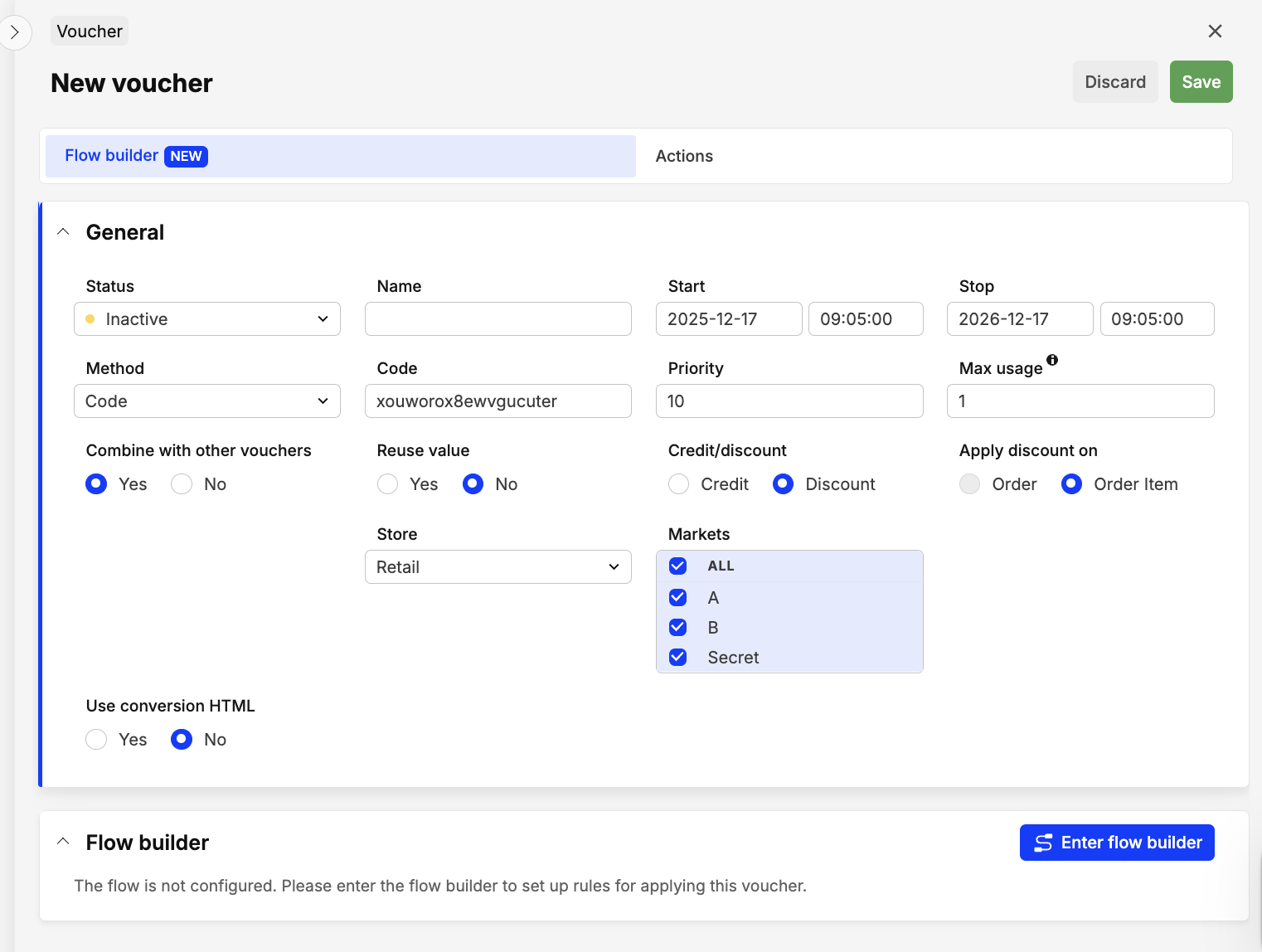The voucher is created the moment you enter the Flow Builder. If you are working with Auto vouchers, set the voucher status to Inactive as a precaution.