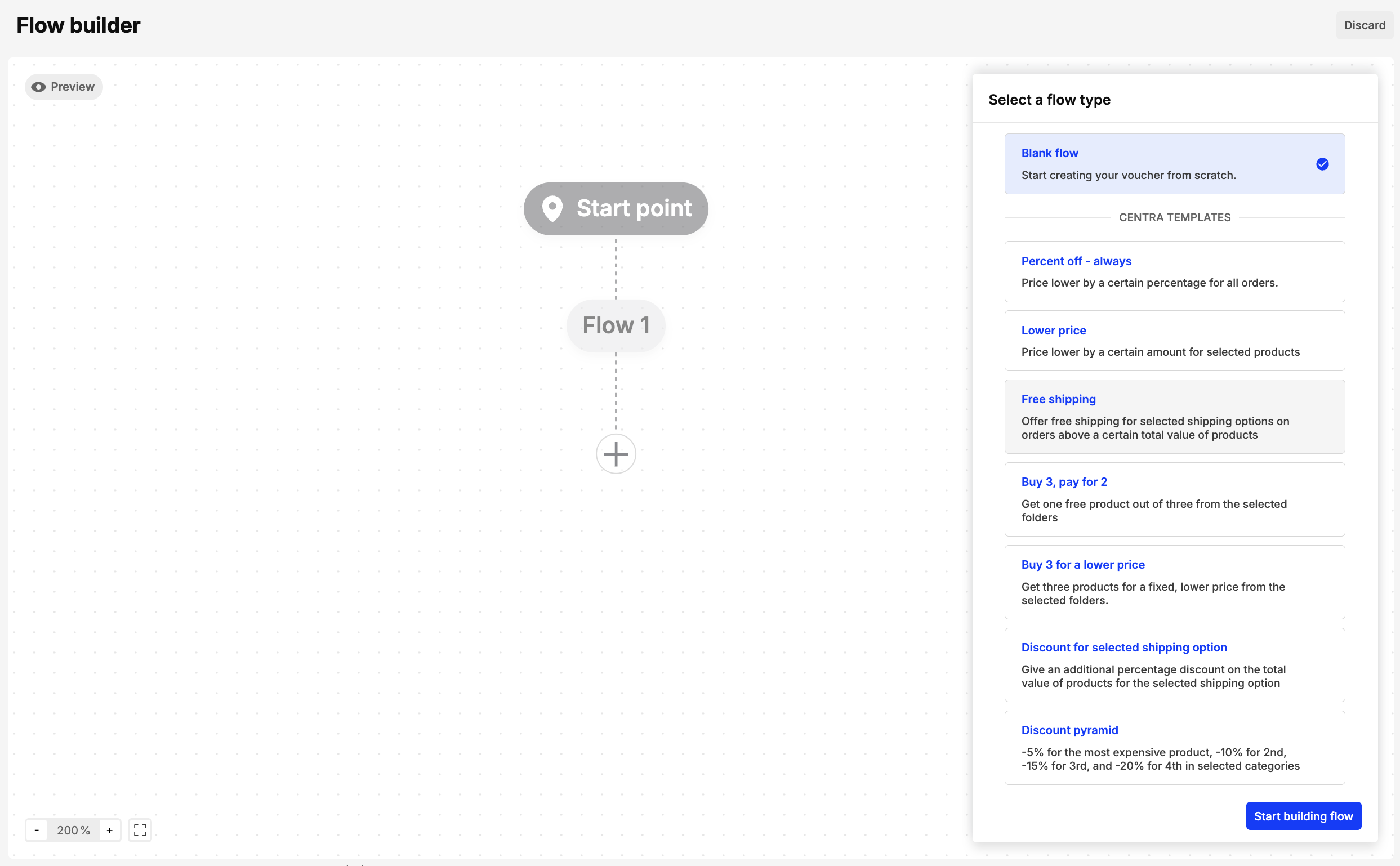 Blank Flow allows you to build a voucher from scratch by adding cards step by step. This gives you full control over how products, orders, and customers move through the logic.