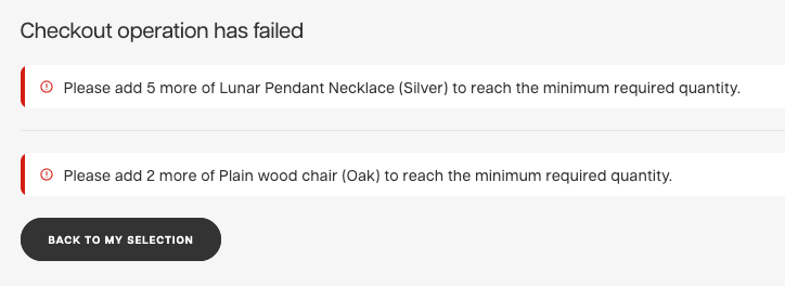 Now, with basket containing 8 chairs, 5 silver necklaces and 5 moon necklaces, and min_order_amounts statis configured to: