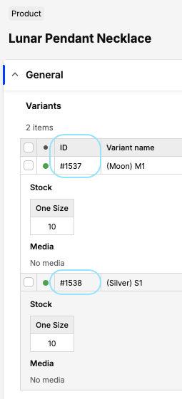 When requiring to purchase a minimum of X product, it will be required for all active variant of that product, so if your product has 2 variants, buyer will need to purchase at least 20 items. To avoid that, you can also configure minimum order limits for a specific variant. Their ID can be found on the variant listing view, just under product information: