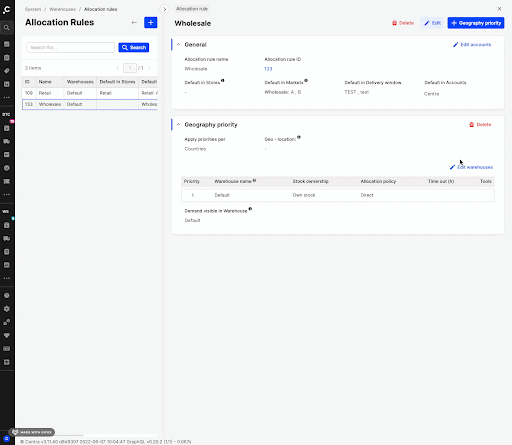 Staying on the same example of the Allocation rules (System > Warehouses > Allocation rules), we can also look at the other subcategory, where both Global edit and section specific edit button are needed. Focusing on the second section of a selected Allocation rule, we can see that the second section is called “Geography priority”. The “Edit warehouses” button can be used to add or remove warehouses in this section. However, once a warehouse is added, the priority of the warehouses needs to be edited within the listed table. For this to happen, the Global edit on the Details top bar needs to be used. See these actions executed below: