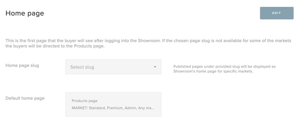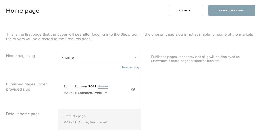 - This is an overview of the pages that you have setup as a homepage: on example from above, page Spring Summer 2021 will be set as a homepage for markets Standard and Premium, and buyers from all the other markets (Admin, Any market) will be automatically directed to the Products page.